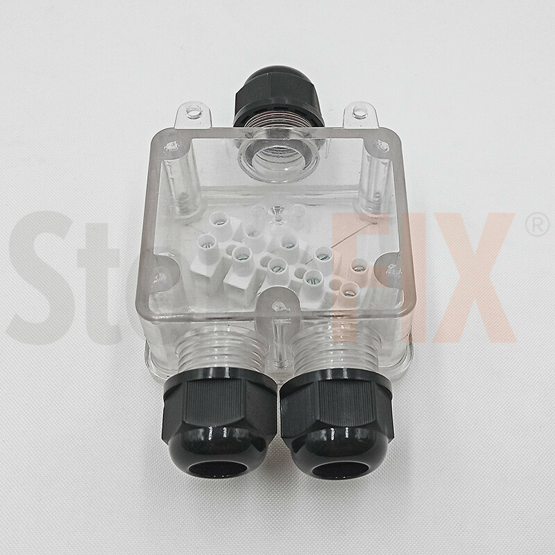 Fabricada en plástico ABS anti llama con certificación IP68, garantiza resistencia total al agua, polvo, humedad y rayos UV. Su tapa transparente permite inspeccionar fácilmente las conexiones internas, mientras su junta de goma asegura un sellado perfecto.