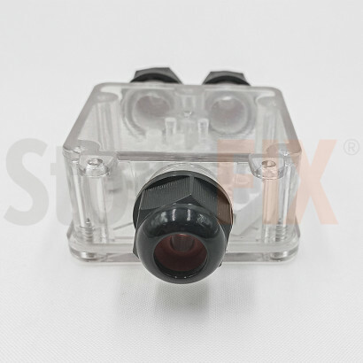 Fabricada en plástico de alta resistencia con conectores PG9, ofrece un sellado hermético frente al agua, polvo y rayos UV.