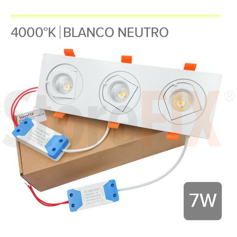 Disponibles en versiones simple (7W), doble (14W) y triple (21W), todos con luz blanco neutro de 4000K y diseño empotrable. Ideales para hogares, oficinas, vitrinas y tiendas, permiten direccionar la luz según necesidad gracias a su estructura basculante.