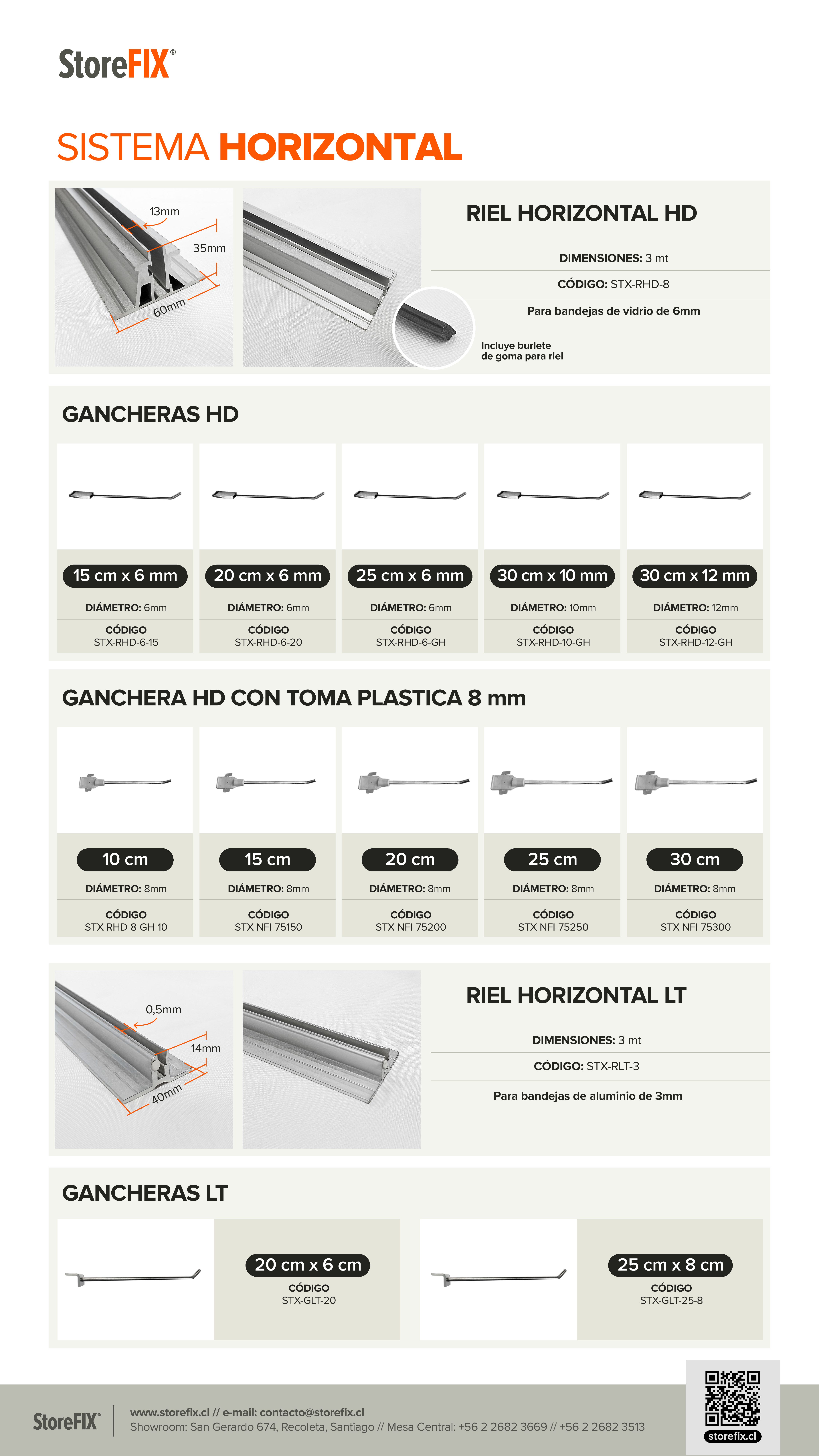 Ideal para tiendas de retail, ferreterías o showrooms que requieren orden, durabilidad y presentación profesional. Compatible con rieles horizontales HD.