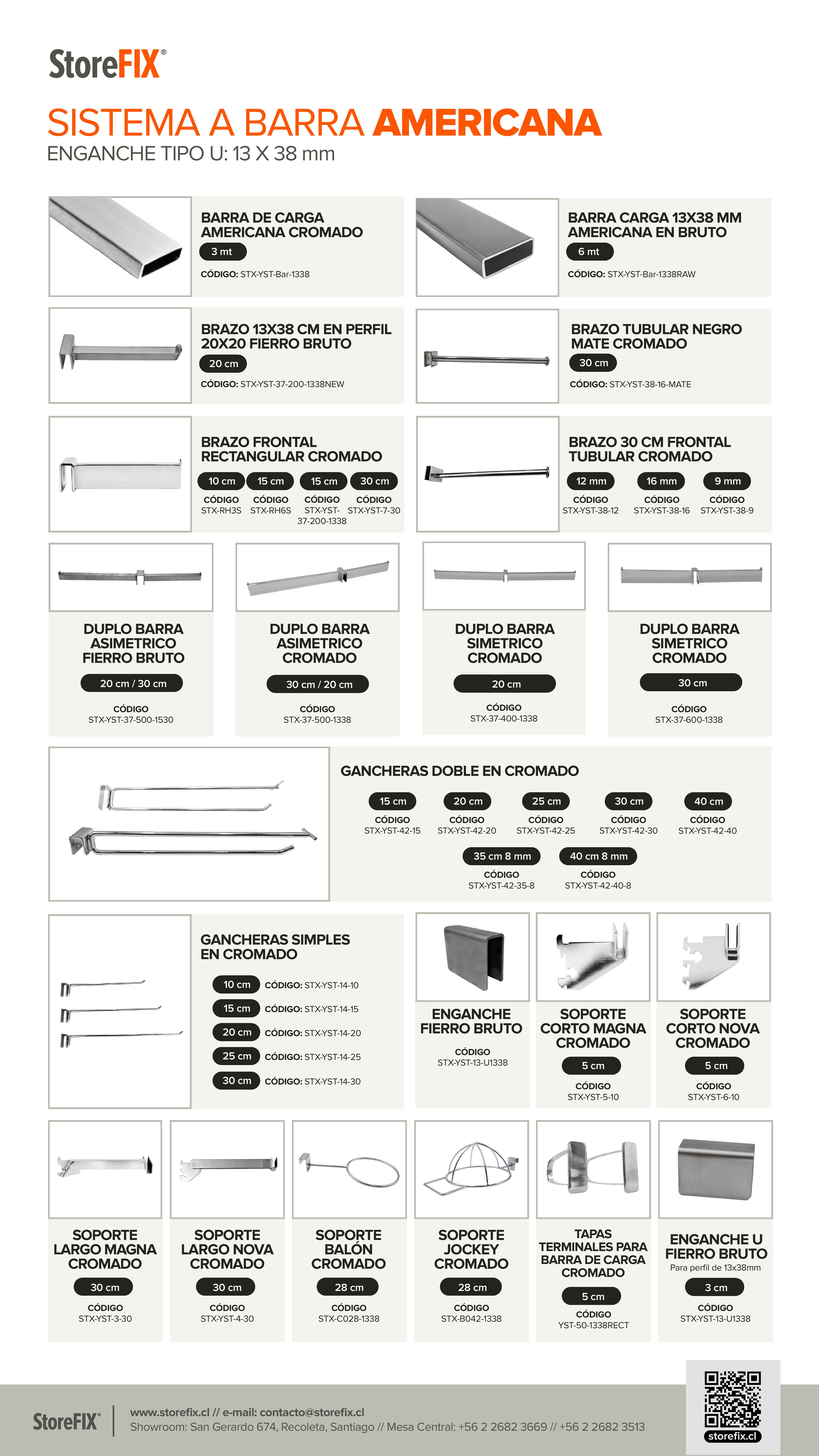 Compatible con barras de carga tipo americana, su diseño metálico cromado proporciona durabilidad, brillo y una presentación profesional en entornos retail o vitrinas comerciales.
