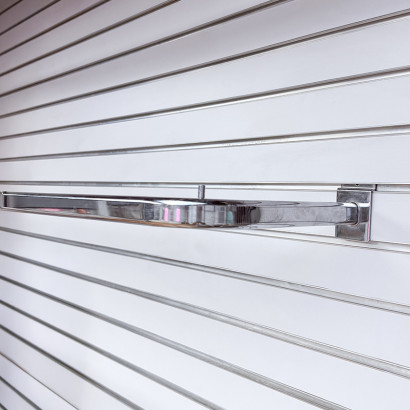El brazo frontal tubular a panel ranurado de StoreFIX es un accesorio cromado resistente y funcional, diseñado para exhibir ropa en perchas de manera ordenada y frontal.