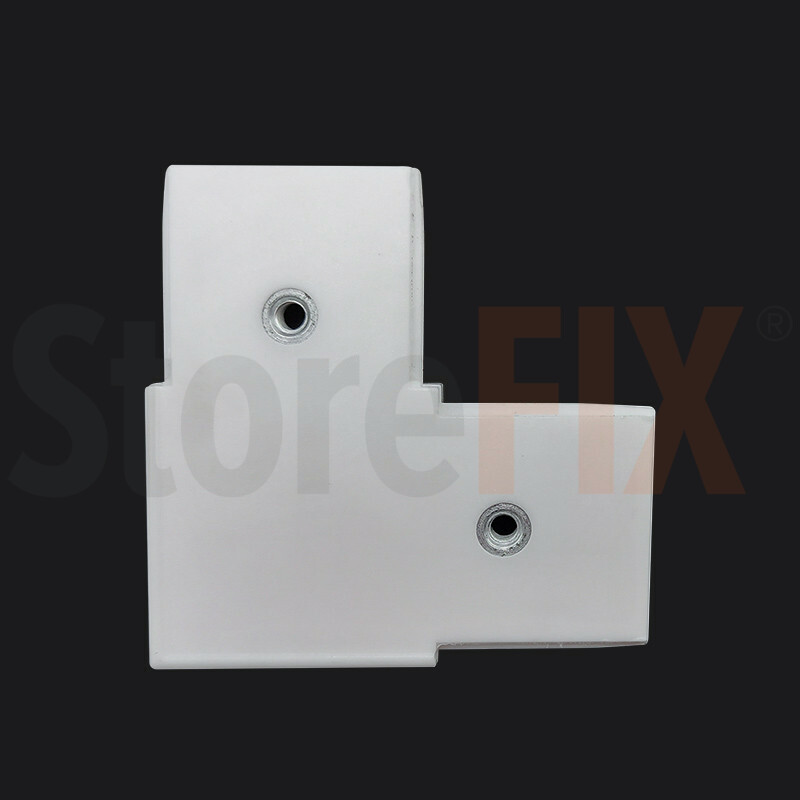 Conector magnético angular 90°, en forma de L, disponible en blanco y negro, que forma parte de la gama de accesorios para riel magnético slim para salida 48V, cuya instalación es sobrepuesto, están disponible para la línea de focos MG27 conectores alimentadores, conectores lineales además de conectores tipo L, T, X, en colores blanco y negro.