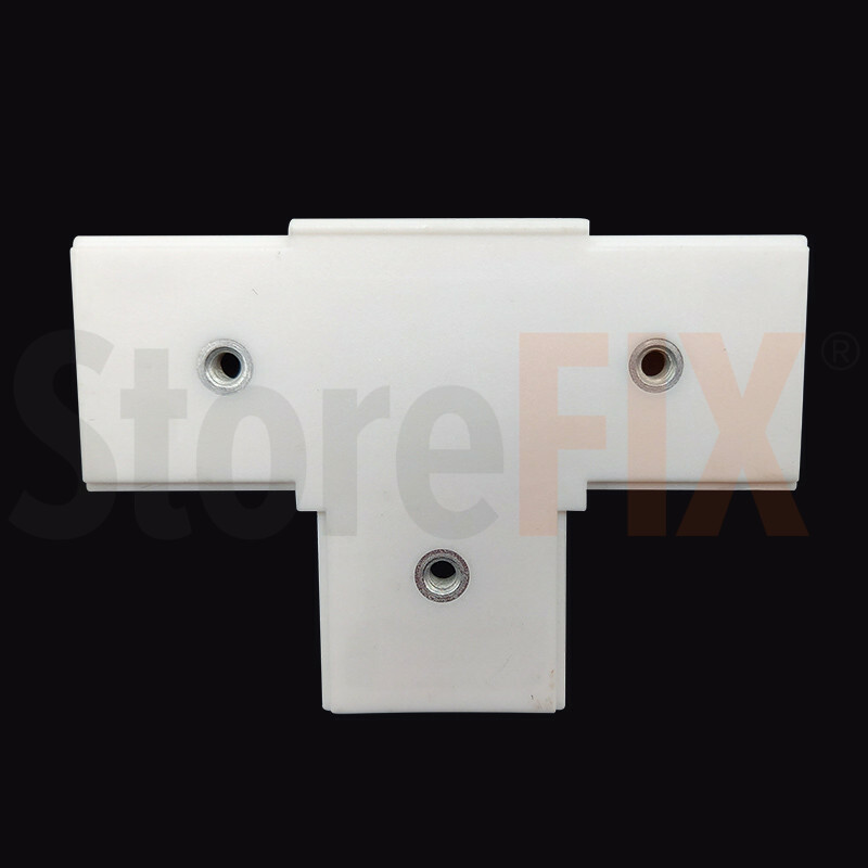 Conector magnético en forma de T, disponible en blanco y negro, que forma parte de la gama de accesorios para riel magnético slim para salida 48V, cuya instalación es sobrepuesto, están disponible para la línea de focos MG27 conectores alimentadores, conectores lineales además de conectores tipo L, T, X, en colores blanco y negro.
